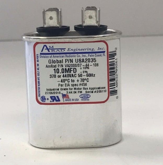 The AmRad Run Capacitor USA2035ย comes packed with features. To begin with, they are manufactured by American Radionics, the manufacturers of Turbo products. Also, all USA capacitors are 370/440 single and dual voltage. Furthermore, they are backed by a five-year warranty vs. the typical one-year warranty provided by other manufacturers. Each capacitor is tested multiple times throughout the manufacturing process and Oil-filled with a patented non-PCB oil. It’s also 10,000 AFC protected. UL 810 approved and OEM approved.