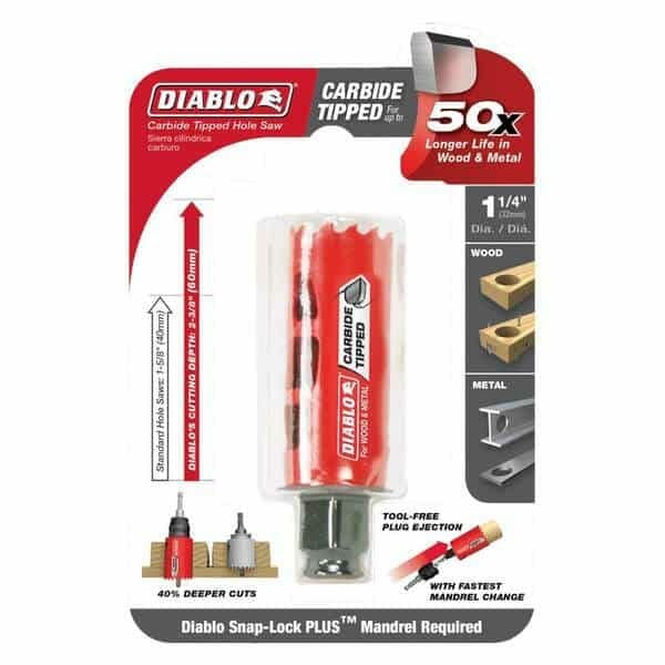 Diablo 1-1/4 in. Carbide-Tipped Wood and Metal Holesaw DHS1250CT is the hole saw on the market to cut wood and metal (wood, nail-embedded wood, plastic, aluminum, metal, cast iron, stainless steel, and metal). The Diablo 1-1/4 in. Carbide-Tipped Wood and Metal Holesaw deliver 50 times longer cutting life than bi-metal; these new carbide-tipped hole saws offer faster-cutting performance and increased productivity.