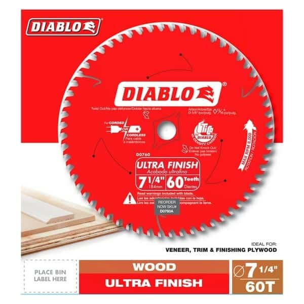 The Diablo D0760A 7‑1/4 in. x 60 Tooth Ultra Finish Saw Blade offers the quality that fine cabinet makers expect with the capability to handle the extreme conditions of professional construction. The Diablo D0760A produces a clean, chip-free cut that requires little to no sanding. The 60 Tooth Ultra Finish Saw Blade is ideal for crosscutting oak, pine, melamine, veneer plywood, and delicate molding.