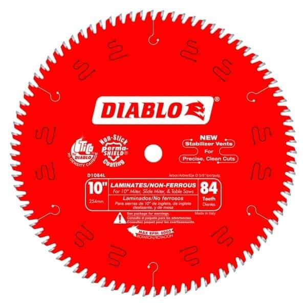 D1084L Diablo 10 in. x 84 Tooth Laminates & Non-Ferrous Metals Saw Blade thin kerf saw blade has a Triple Chip Grind (TCG) Tooth Design for long life and a clean, burr-free finish. Diablo’s knife is ideal for on-the-job cutting of nonferrous metal such as copper pipe, aluminum extrusions, brass plate, etc.