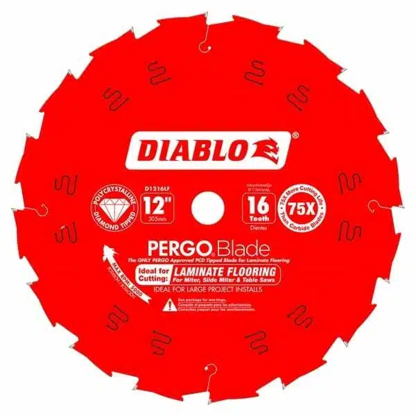 Diablo’s D1216LF New Tooth PCD Laminate Flooring Pergo Blade is the first blades specifically designed for cutting laminate flooring in a chop saw application. This radical new design delivers 75 times the cutting performance compared to a carbide-tipped saw blade. This blade is the only approved blade by the Pergo brand for cutting their material.