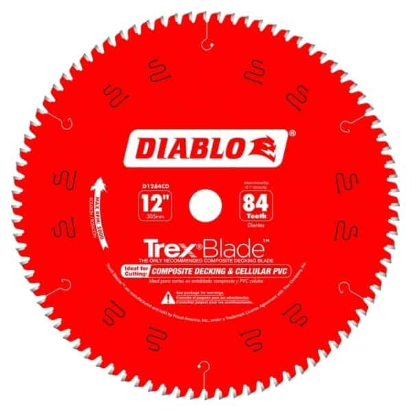 The Diablo D1284CD 12 in. x 84 Tooth Composite Material / Plastics TrexBlade is the only recommended composite decking by Trex Company when cutting composite decking materials. These Diablo D1284CD new blades deliver maximum performance and the highest quality of finish, making it a ‘must-have’ tool for both professionals and DIYers planning composite decking projects. Diablo’s new saw blade series has a modified triple chip tooth grind design, Perma-SHIELD® non-stick coating, and specific TiCo™ Hi-Density carbide to deliver more efficient and cleaner cuts with no swirl marks, less “gumming” of blade teeth, and longer cutting life.