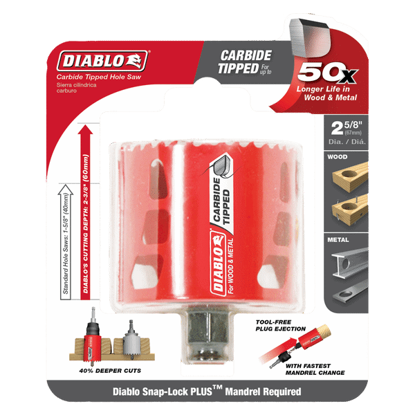 Diablo introduces the first carbide-tipped hole saws on the market to cut both wood and metal (wood, nail-embedded wood, plastic, aluminum, metal, cast iron, stainless steel and metal). Delivering 50 times longer cutting life than bi-metal, these new carbide-tipped hole saws offer faster cutting performance and increased productivity.