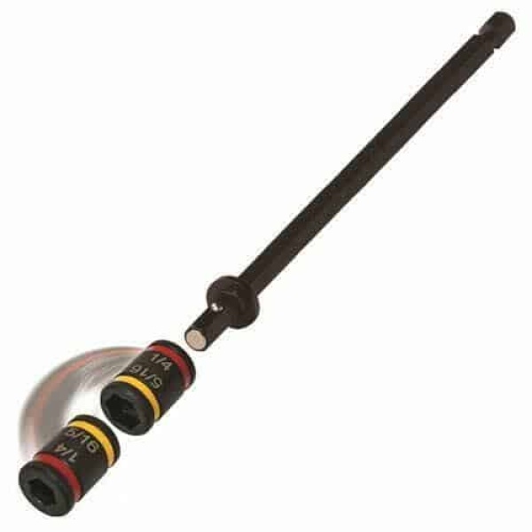 Quickly change between 1/4in. and 5/16in. hex sizes with Malco’s unique, exclusive, dual-sided magnetic hex drivers. The reversible hex socket fits over a 1/4-inch magnet-tipped, ball locking hex shaft, and can be quickly reversed to change sizes. Eliminate troublesome buildup of metal shavings in the hex tip with the “Easy Clean Magnet”. Just swipe with a glove or shop towel to clear any metal shavings. Tested torque of the reversible hex chuck driver design is equal to one-piece drivers.