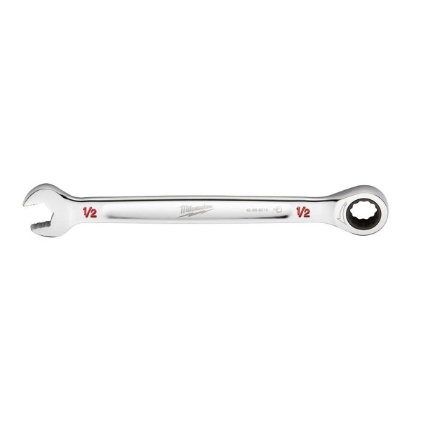 The MILWAUKEEยฎ 1/2 in. SAE Ratcheting Combination Wrench features 2.5 degrees of arc swing and 144 ratcheting positions, allowing quick and efficient work in tight spaces. This wrench has double-stacked pawls within the ratcheting mechanism, which increases durability and extends the life of the tool. The MAXBITEโข Open-End Grip improves the wrench’s grip on nuts and bolts, offering 25% more torque than smooth-faced wrenches. The combination wrench features an ergonomic I-Beam handle design for improved comfort, and ink-filled size labels for easy size identification and quick distinction between SAE and metric sets. The MILWAUKEEยฎ 1/2 in. SAE ratcheting combination wrench features a Lifetime Guarantee.