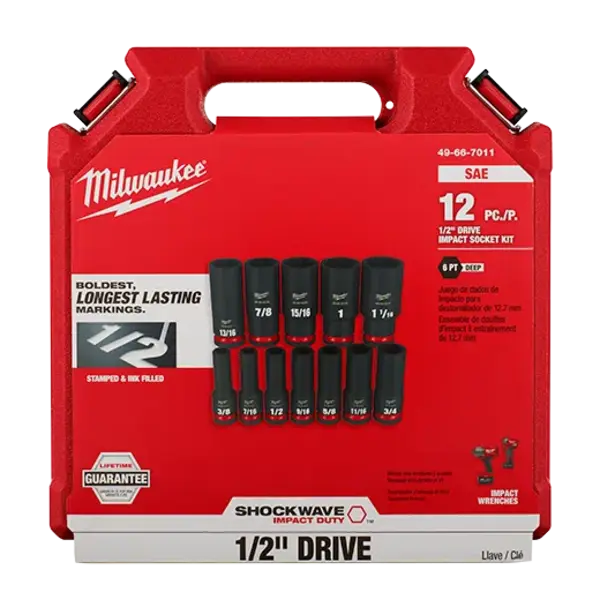 Our Milwaukee 49-66-7011 SHOCKWAVE Impact Duty 1/2″ Drive 6 Point Socket Sets feature the boldest, longest-lasting markings and extreme impact durability in high torque applications. The stamped and ink-filled size marking enables you to select the right socket every time throughout the life of the socket. These Milwaukee 49-66-7011 sockets are engineered with high-strength forged steel for optimized performance in heavy-duty applications. The non-slip hex geometry prevents fastener rounding, and a dual-hole design and ring groove allows for easy socket attachment and removal. The storage cases are impact-resistant and nest together for easy stacking and storage. All MILWAUKEE SHOCKWAVE Impact Duty Sockets are backed by a Lifetime Guarantee and meet ASME industry standards.