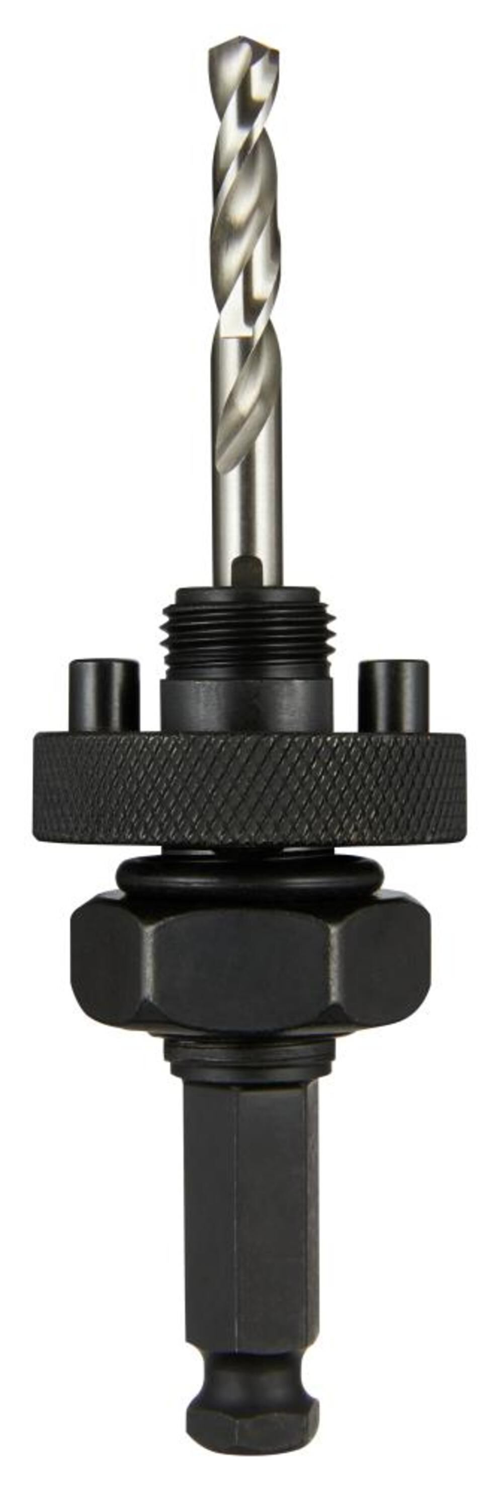 Milwaukee® hole saw arbors are made from hardened carbon steel and alloy steel for greater durability. The 49-56-9100 features a 7/16 in. hex shank, which can be used with any 7/16 in. extension. The 49-56-9100 also features a drive plate which is tightened up to the hole saw to eliminate wobble between the Arbor and hole saw.
