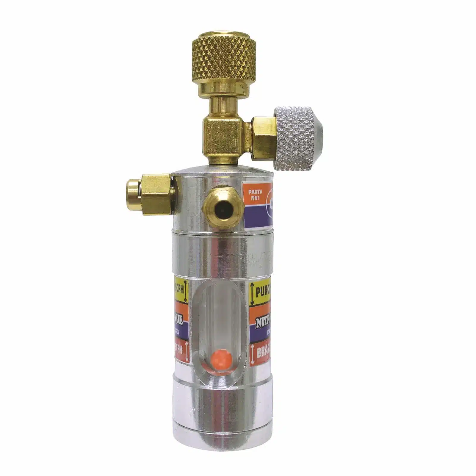 The bright orange float ball and tube are fortified and protected in the aluminum body with wide open windows for a clear view. The easy to see orange float ball visually confirms the nitrogen is flowing and allows the technician to first “PURGE” the copper lines at 20+ SCFH and then reduce the flow to “BRAZE” at 3-5 SCFH during the brazing process thus conserves its consumption and reduces operating cost. The nitrogen must be flowing to displace the oxygen inside the tubing during the brazing process, preventing internal oxidation and the resulting scale. Scale build up inside the tubing can cause blockage in the TXV and within the Air Conditioning and Refrigeration system resulting in premature failure. If the ball does not rise in the tube there is no flow of nitrogen only static pressure and oxygen is not being displaced. The NV1 must be connected to a Nitrogen Regulator with the delivery pressure set at 60 PSI to control the nitrogen gas pressure.