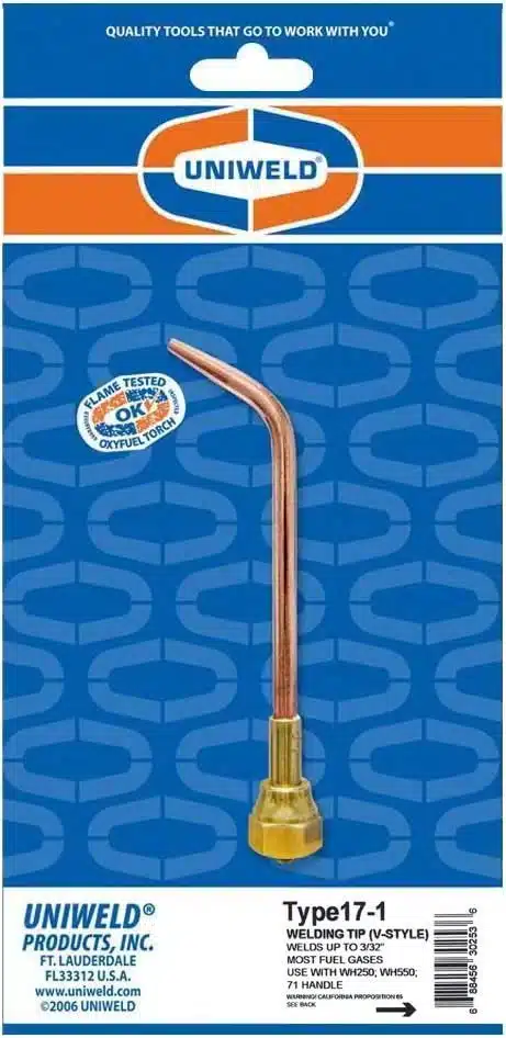 Uniweld Type17-1 weld/braze tip can be used with acetylene, propane, MAP//Pro, and natural gas. Capable of welding 3/32″ of metal, and brazing 3/4″ of copper. Tip elbow is copper, mixer and nut are brass. Has two O-Ring seals so tip nut only needs to be firmly hand tightened. Tip will fit either the 71 or WH550 welding handle.