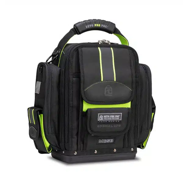 The Veto Pro Pac MB5B SPECIAL OPS is a extra large and highly-configurable front accessed meter bag in a black and Hi-Viz yellow color scheme. Once the bag is loaded out, it can be worn over both shoulders using the included backpack straps, over a single shoulder using the optional padded shoulder strap, or at your side with over-molded gripped handle. Finally, the bag features an additional 8 pockets on the front flap as well as a padded tablet computer pocket on the back. The MB5B SPECIAL OPS stores a variety of hand tools inside the bag while separately storing 1-2 clamp meters in the 2 padded side mounted zippered pockets.