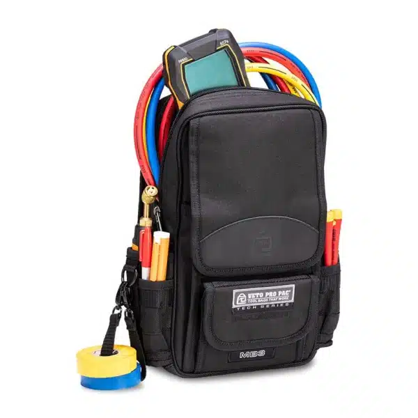 The Veto Pro Pac MB3 BLACKOUT VPP10738 is a “blacked-out” large compact sling-style meter bag that comes with a removable sling-strap and removable carrying handle, so you can choose whether to use as a sling bag or carry it at your side. Capable of storing, transporting and protecting large meters. The main bay is designed for digital manifolds, meters up to 13.5” (34cm) tall and/or a few select hand tools. The back and inside pockets can store wireless probes. Removable backpack straps are sold separately to convert the MB3 Blackout into a small, compact backpack.