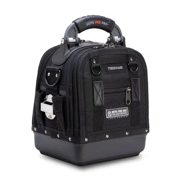 The Veto Pro Pac TECH-MC BLACKOUT is a stealth version of our compact (2 inches shorter than the TECH-MCT), full-featured service, repair or installation tool bag that features everything you have come to expect from Veto Pro Pac: patented center panel, heavy duty construction and stabilizing injection molded waterproof base that keeps tools dry even in wet conditions. With 38 pockets, two storage bays and 10.5” (27cm) of vertical interior storage space, this bag offers maximum storage for hand tools, meters and cordless drills in the MC platform. The TECH MC BLACKOUT includes D-rings, bit extension and memory stick pockets, and a stainless steel tape clip as well as a quick access outside pocket for drill bit extensions and small items. Featuring Veto Pro Pac’s proprietary V-SWAP™ system. Alternative tool pocket panels are available separately and can be swapped-out enabling tool, gear or job specific storage solutions.